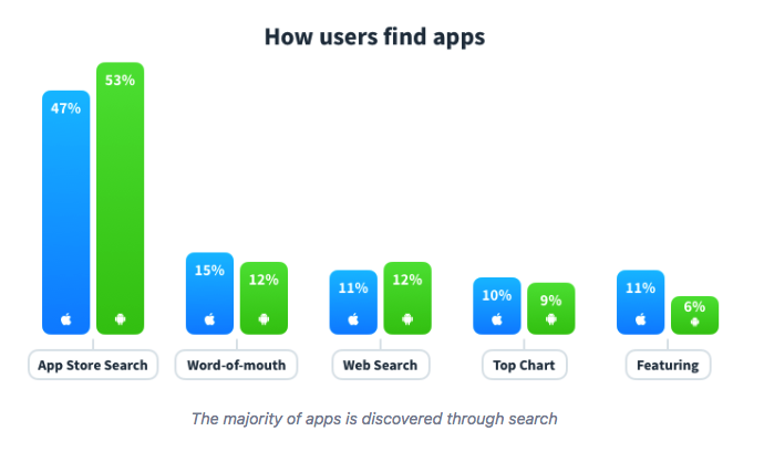 A lot of app searches are performed on Google Play (53%) or on the Apple Store (47%).