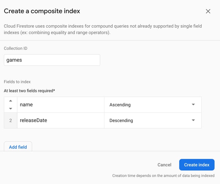Sometimes you will run into queries that can’t be executed. Fortunately, Firestore handles these types of cases automatically and you will see this message in the console: