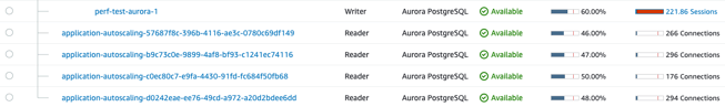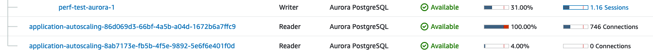As you can see the Aurora read-replicas scaled up under heavy use of CPU, but there are no connections on the new scaled-out read-replica. So what's going on? It turns out the application keeps a TCP connection (session) to the previous read-replica and only a few connections come from freshly started applications during the EC2 autoscaling process. This problem can be resolved in two ways: