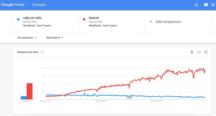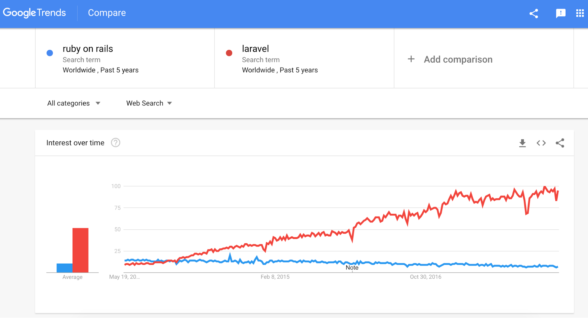 According to Google Trends, Laravel quickly became more popular than Rails, which is quite obvious as there are more PHP developers than Ruby. Rails on the other hand, has enjoyed very stable interest which has decreased only slightly over the past five years.