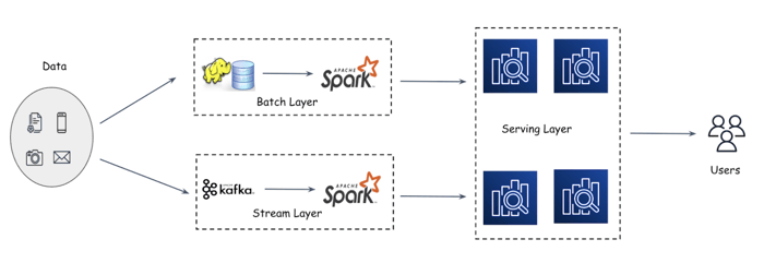 When compared to alternative frameworks, Spark retains its advantage of a tightly integrated, high-level API for data processing with minimal changes between batch and streaming. To understand this better, let’s look at a data architecture called Lambda, introduced by Nathan Marz in a blog post, “How to beat the CAP Theorem.” This approach aims to consolidate streaming and batch-processing layers, as shown below.