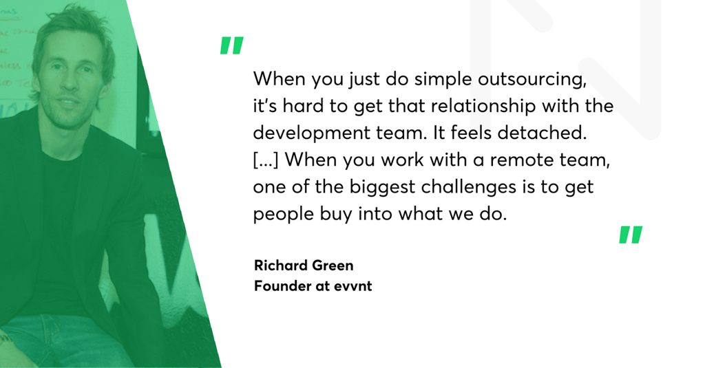 Richard: You go looking abroad, so you end up looking at India, because it’s one of the cheapest. However, when you just do simple outsourcing, it’s hard to get that relationship with the development team and the products. It feels detached. If you’re working in evvnt, you get that commitment margin of understanding. When you work with a remote team, one of the biggest challenges is to get people buy into what we do.