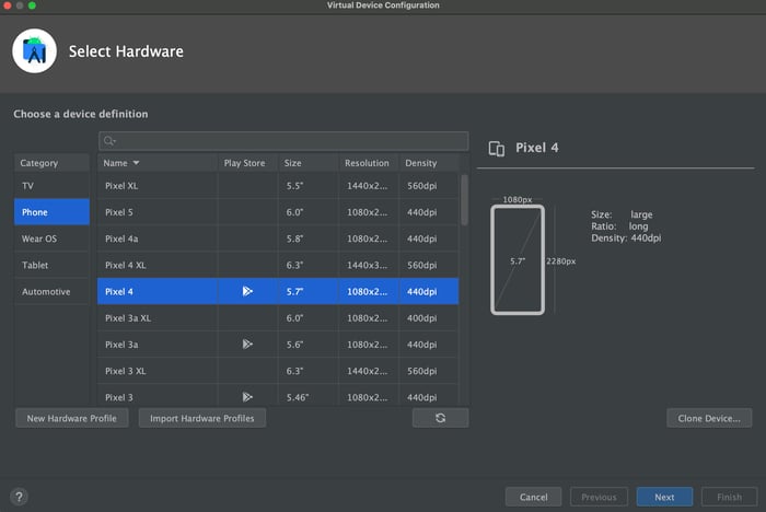 Android Virtual Device (AVD) is a configuration used to create and manage Android Virtual Devices, including Android phones, tablets, Wear OSs, Android TVs, or Automotive OS devices - all of these can be managed via the Device Manager feature that you can launch directly in Android Studio. AVD allows developers to run different Android versions on the development machine.