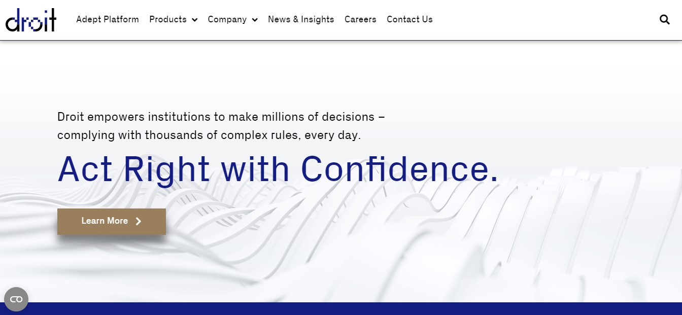 Droit is a patented New York fintech platform offering solutions to improve global regulatory compliance and real-time controls. It develops pre-trade and post-trade controls solutions, including evaluating transaction permissibility, and compliant regulatory reporting.