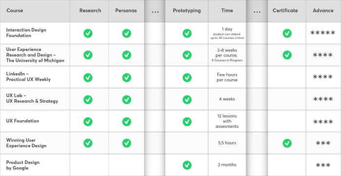 Below, you will find a table with interesting courses for every stage of advancement in User Experience. We’ve considered many areas there: soft skills, interpretation of data, prototyping, and translating all the above into the language of design.