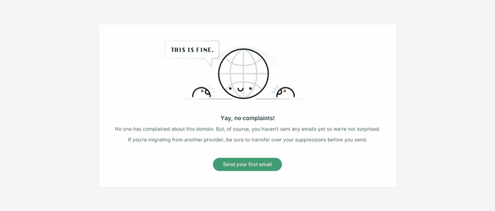 [ Image: An illustrated character used by Mailgun to present the eventuality of domain complaints in a light way. Referencing every project manager’s favourite meme — the “this is fine” dog. ] Source: Mailgun / KC Green