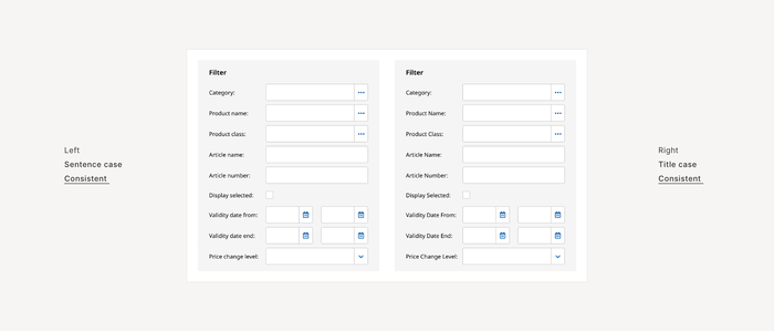 [ Image: 3 examples of forms, first one following sentence casing rules (consistent), second — title casing (consistent), and in the third one, a mixture of both is used, which you should never do ] Source: Anton Sten