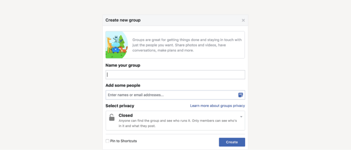 [ Image: A short form by Facebook making starting a community feel easy-breezy. The form’s function is clearly communicated—there’s a light intro briefly outlining the idea behind Groups on Facebook (and what makes them great), and a tiny illustration featuring a group of friendly characters, surrounded by nature. ] Source: Facebook