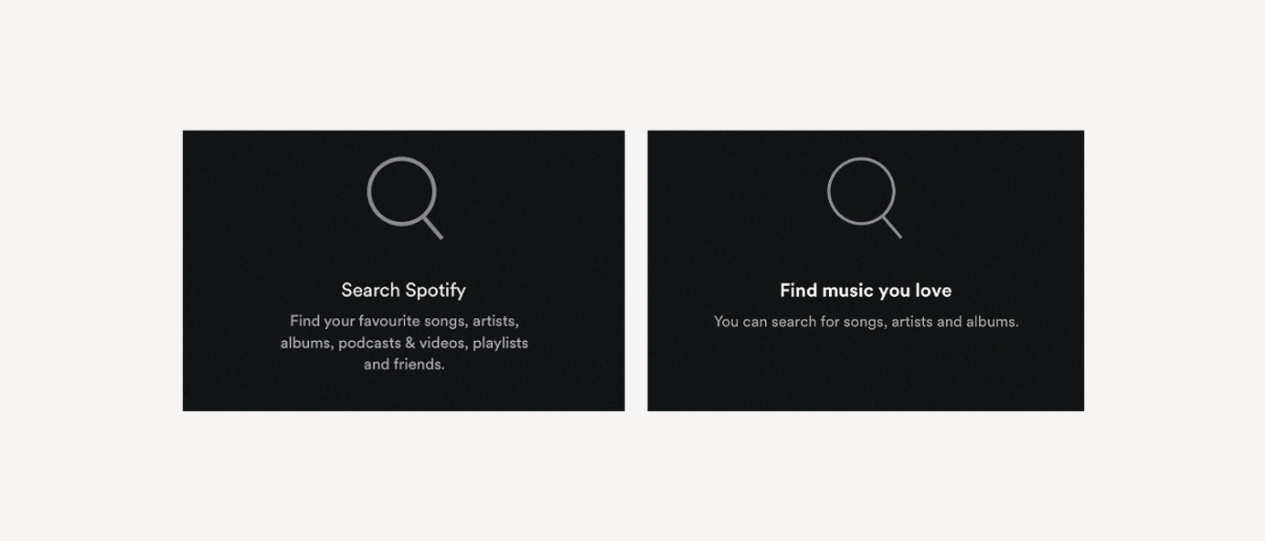 [ Image: Two versions of the same screen juxtaposed. Both feature the same looking glass icon and each has a header and a subheader. The first one says Search Spotify — Find your favourite songs, artists, albums, podcasts & videos, playlists and friends. The second one leads with Find music you love, and follows with You can search for songs, artists and albums. ] — Source: Marina Posniak