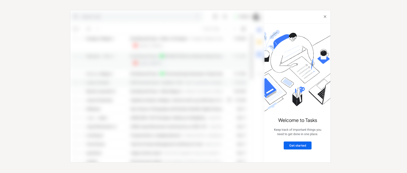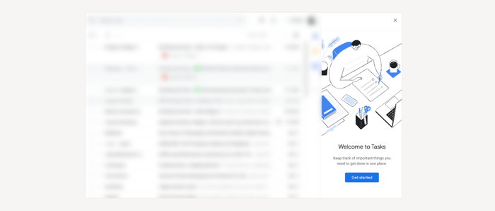[ Image: Welcome to Tasks — Keep track of important things you need to get done in one place. Button: Get started. There’s also a two-tone, black and blue, illustration of a character at their desk, powering through a to-do list. ] To be honest, this beautiful graphic is actually preventing me from starting to use Google Tasks, because when I do — I won’t see it anymore. The wording is concise and clear though! Source: Google
