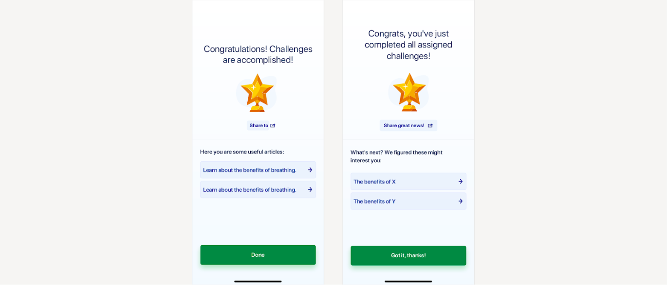 [ Image: A before and after comparison of two versions of an app screen, featuring an achievement badge. The original says “Congratulations! Challenges are accomplished! — Share — Here you are some useful articles…”. The updated version says: “Congrats, you’ve just completed all assigned challenges! — Share great news! — What’s next? We figured these might interest you…”. ] Even “assigned” here suggests there might be more coming the user’s way, more challenges to-be-assigned soon. The social aspect of sharing progress with friends is also emphasized. There is a sense of continuity even after all challenges have been completed by the user. Source: Strokemark