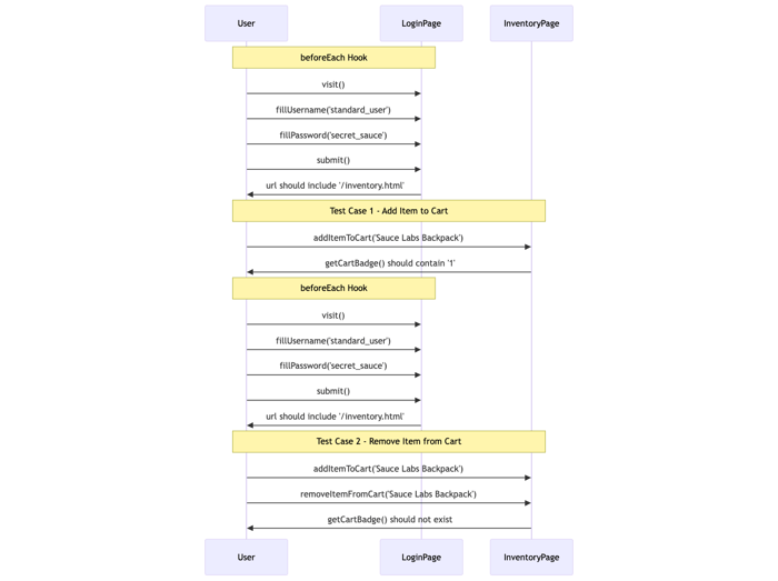 The resulting diagram effectively represents the sequences, showing which entities interact at each stage—for example, the user interacts with the inventory page (addItemToCart), and later the inventory page confirms that the item was added to the cart (getCartBadge):