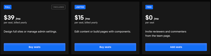 - Full seats allow complete design, admin, and publishing access, while limited seats serve content editing and component-based page building. Free seats let team members review and comment without making changes.