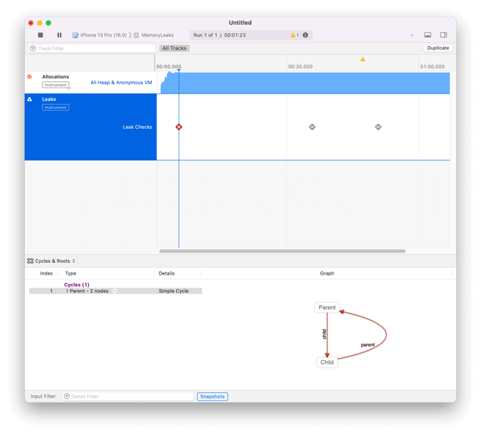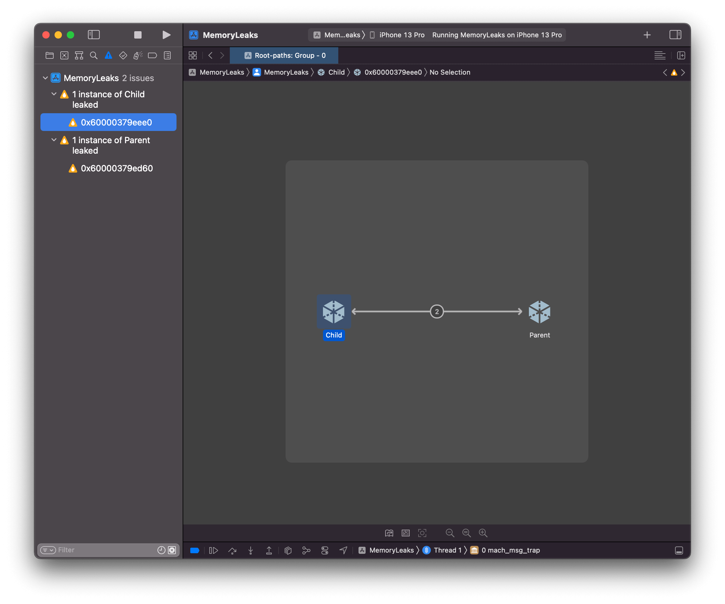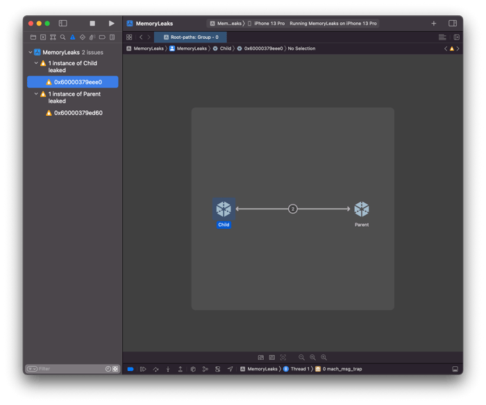 If leaks are detected, you’ll be provided with detailed information including a stack trace and sometimes (unfortunately not always) a memory graph that visually presents how the retain cycle was created. It should be noted that the app can be used to track the runtime on both the simulator and physical device.