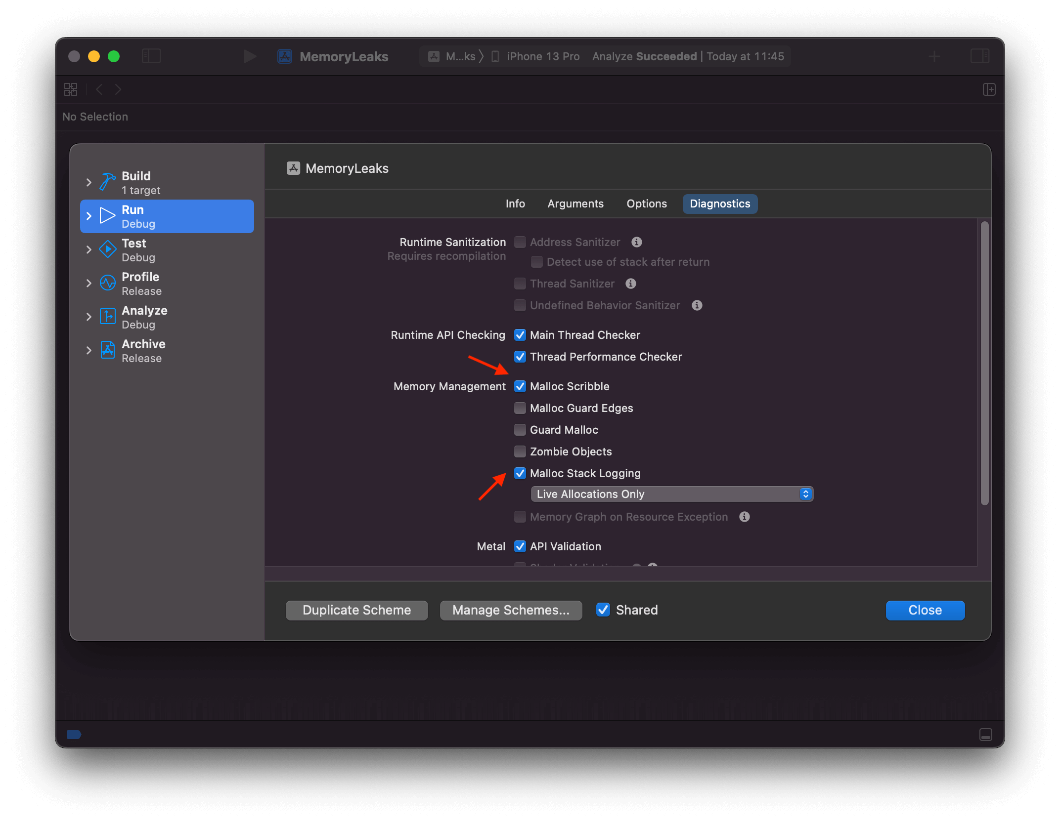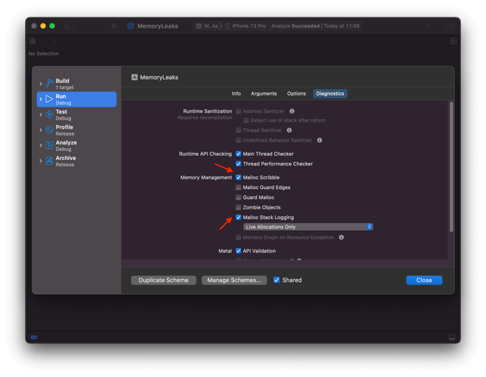 Remember: Xcode is not always 100% accurate in identifying memory leaks. Once you’ve finished debugging, don’t forget to turn off the Malloc Scribble and MallocStackLogging settings in the run scheme for your app otherwise they will negatively affect performance.