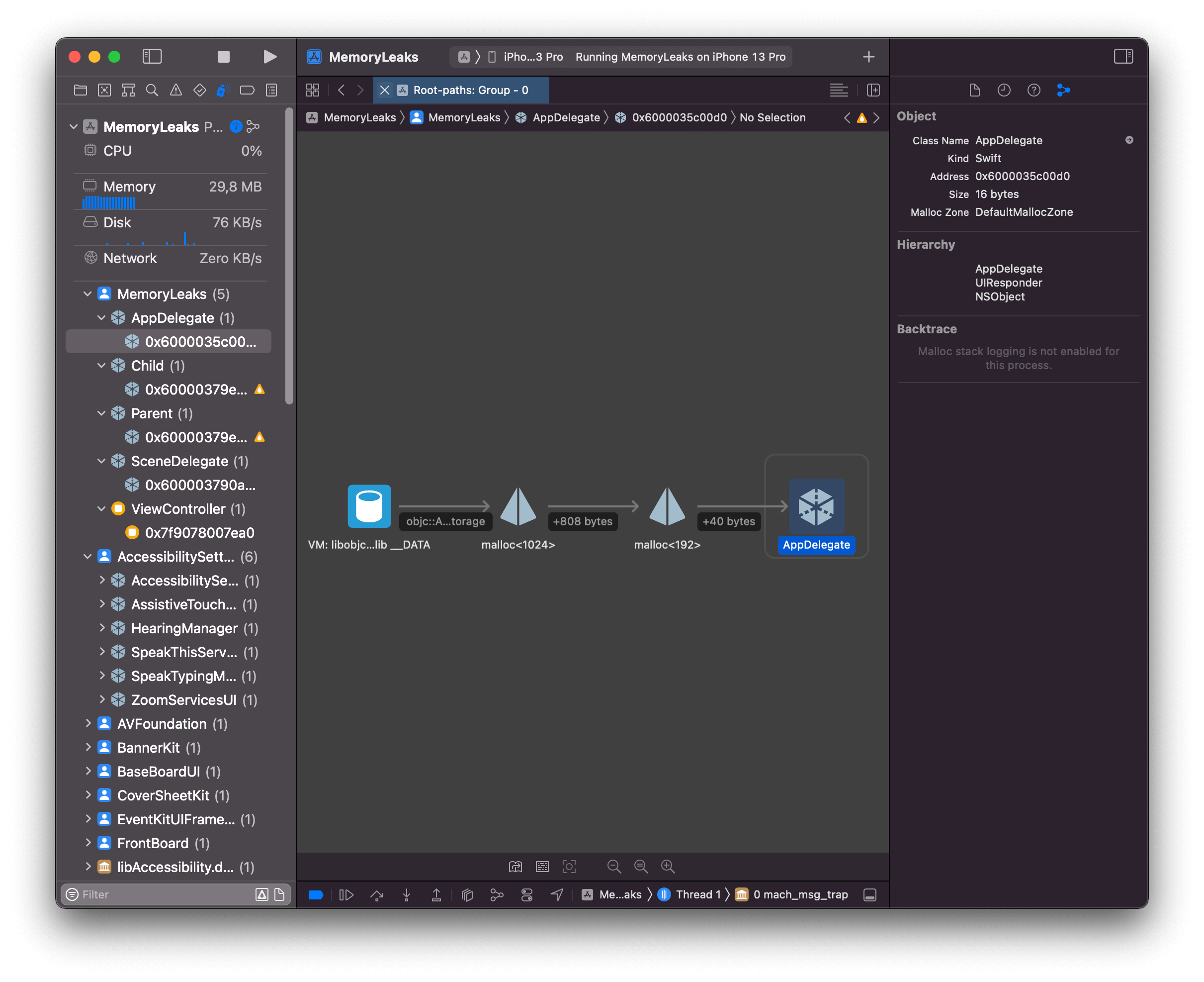 To make memory leak detection easier, Apple introduced the Memory Graph debugger in Xcode 9, allowing developers to stop an app from running and gain a snapshot of the current memory state. From there, a list of all the objects being held in the memory heap can be accessed, and selecting an object reveals all of the objects that are referencing it as well as a backtrace of the object.