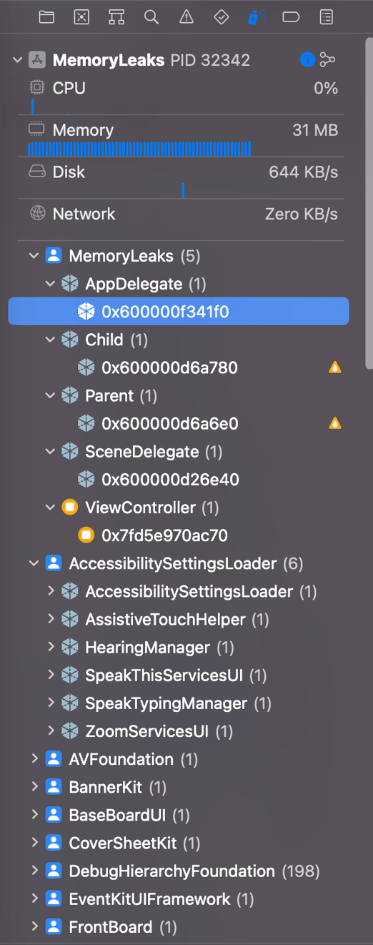 To be thorough when detecting memory leaks, you should run the app and navigate through all possible flows by opening the same view controllers several times and entering the memory graph debugger to look at the memory heap. From there, you’ll want to identify objects that shouldn’t be present in the memory heap at that time. For example: