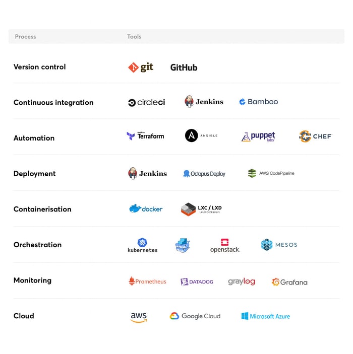 DevOps engineers have some familiarity with GitHub or Bitbucket for source control, as well as Bamboo or Jenkins for continuous integration. Docker or LXD can be used for containerisation, while Kubernetes, Swarm and Apache Mesos are server orchestration tools.