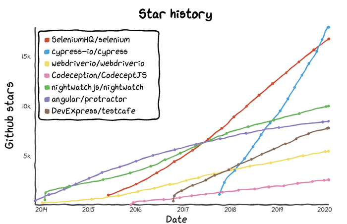 All frameworks have their pros and cons. For me, the most important thing is accessibility. With modern tools like Cypress and TestCafe, you can feel they were made to address the pains of the previous generation of testing software. Another thing I value is the community and support of my testing peers. Let's take a look at the graph below which shows the number of stars for each repository on GitHub over time.