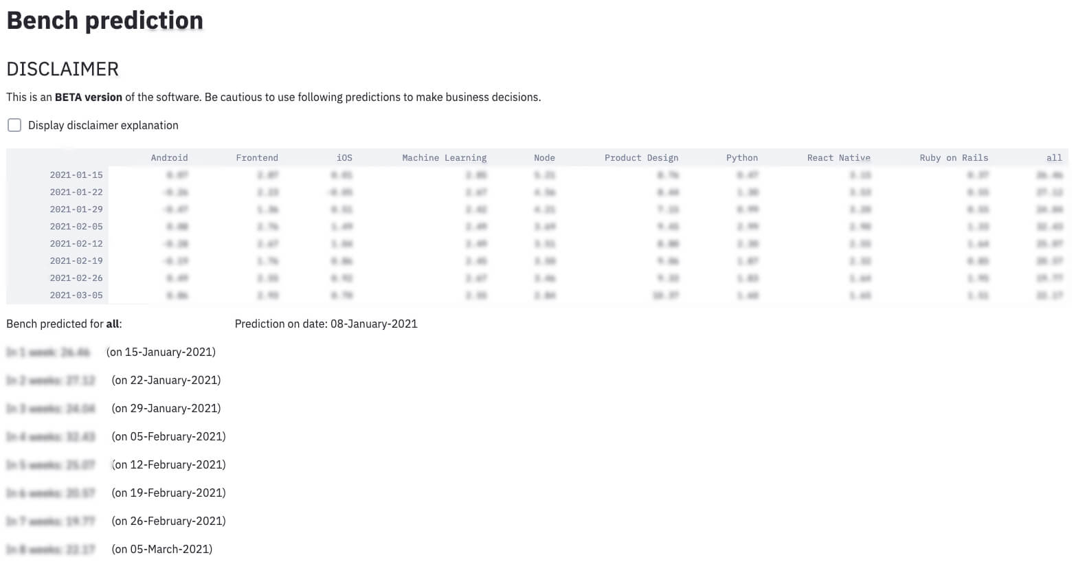 First, the goal was to improve the accuracy of predicting the size of the bench that we would need to have in four weeks. Then, having gathered data, we decided to see if we could make predictions for up to eight weeks in advance.