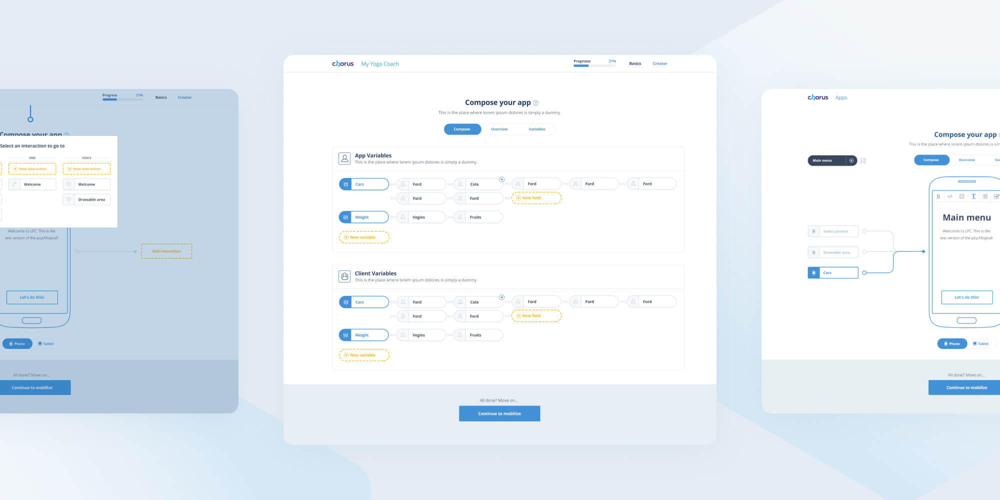 We broke down the process of app building into steps with primary tasks that need to be completed before moving forward. Apps created in Chorus are data driven and can operate in 3 different channels. We also designed native iOS app for handling notifications.