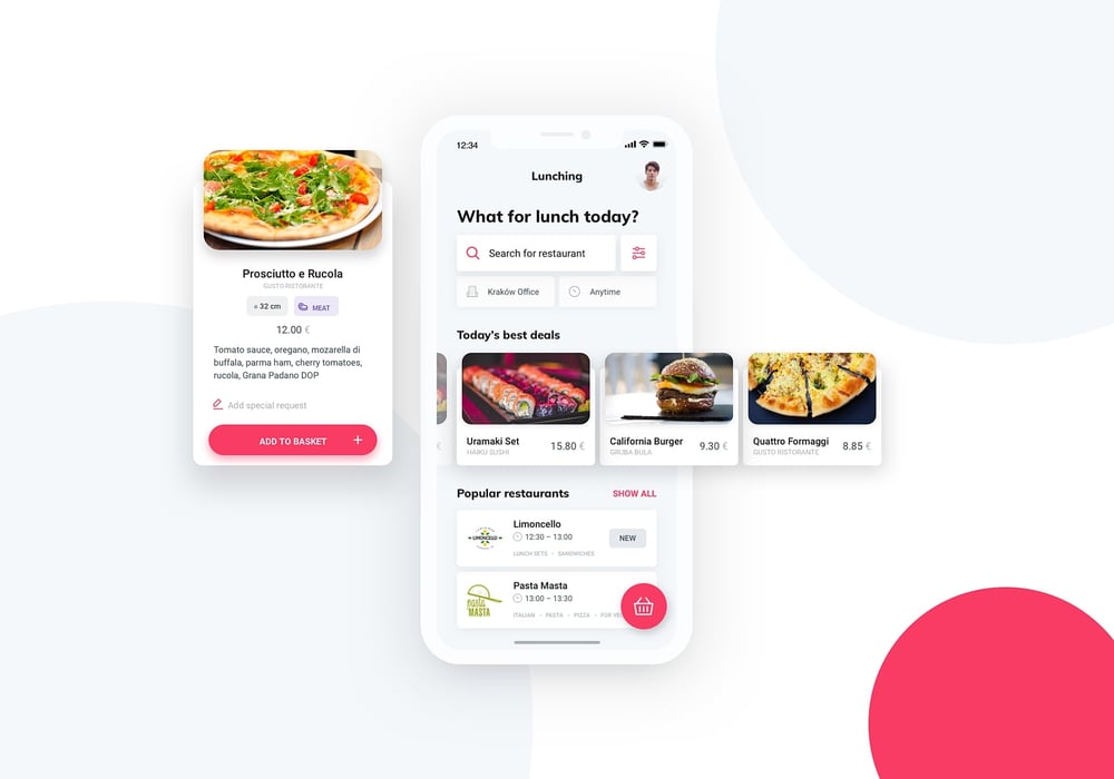 Thanks to the Lunching app you can see the nearest restaurants, check the best deals, and see the full menu prepared for today. We’ve designed a simple 4-click ordering flow to not waste your time on choosing today’s meal. All the amazing food photos are spiced up with beautiful animations.