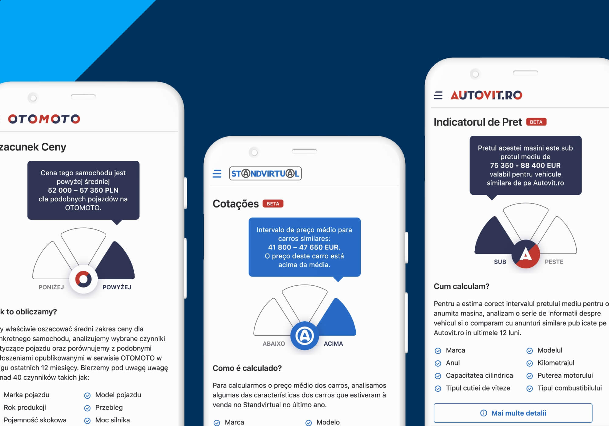 This was accomplished through the design and implementation of a price evaluation feature that presents in a clear, visual way whether a given car's price is within expectations, higher, or lower compared to other similar offers.