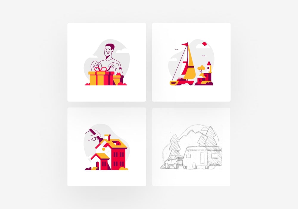 The client wanted to display the full package of loans without losing the human touch. With that in mind, we worked on the first round of sketches. In order to make the illustrations more playful, we decided to use two different approaches for objects and characters.