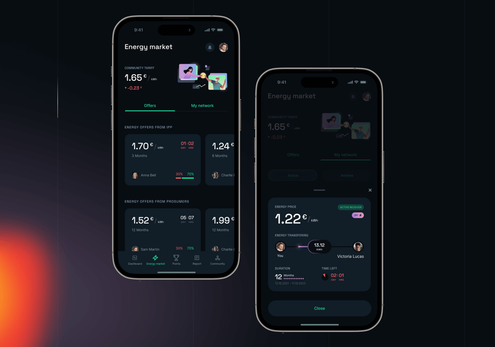 The main app feature is intuitive and adjusted to user needs. It allows contractors to participate in the energy market by sharing, trading, or giving away surplus energy. It also plays a crucial role in raising their awareness of how energy is consumed by individuals and how important the transition to renewable energy is.