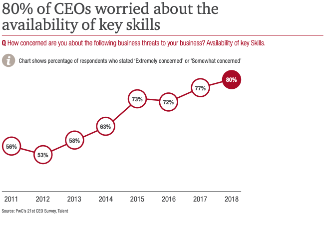 Understanding of these skills’ value attracts a lot of interest from the most talented members of the workforce, but at the same time companies find it challenging to recruit employees with these skills. Research by PwC states that 80% of CEOs are concerned about not being able to find talent with the right digital skills.