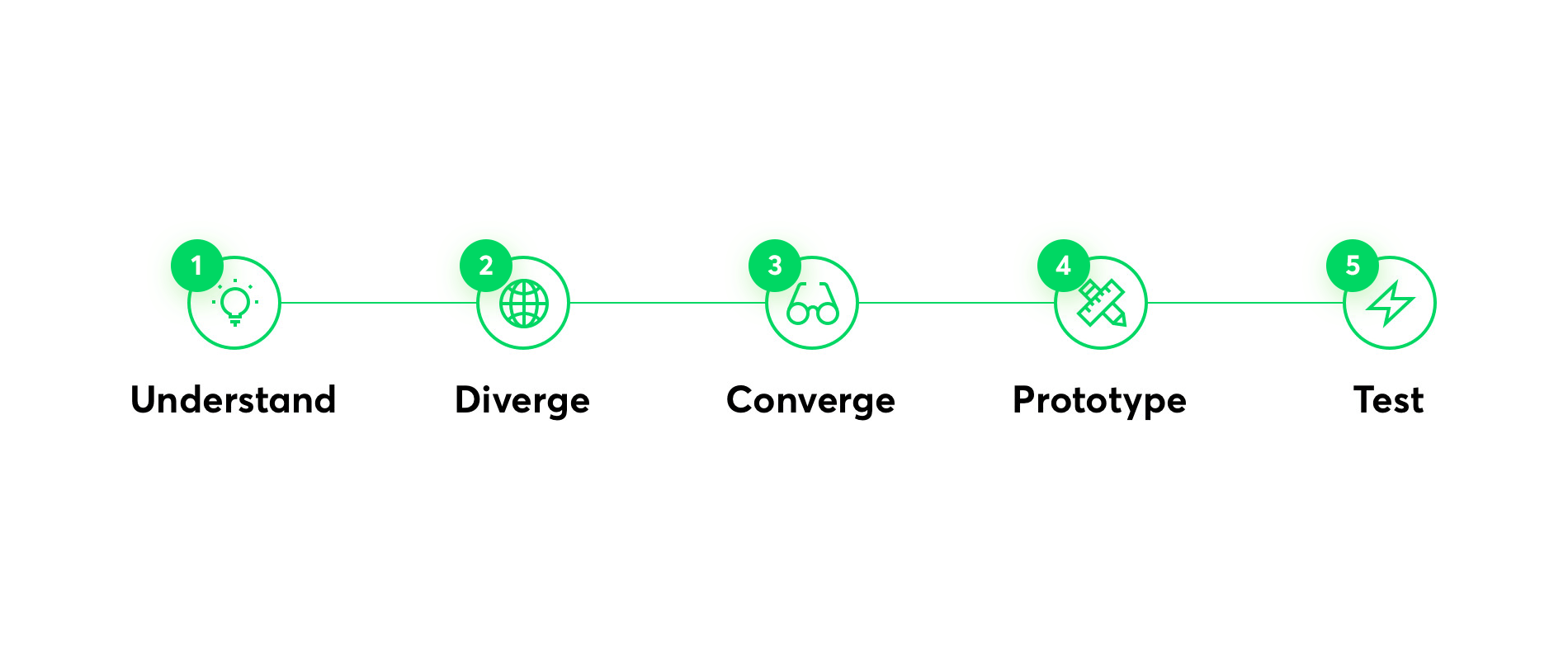 A Product Design Sprint has five phases (each usually takes a day). These are: Understand, Diverge, Converge, Prototype, and Test.