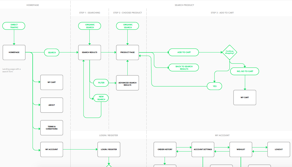 Wireframing can be roughly divided into two stages: creating user flow diagrams, which is then followed by single-page wireframing.