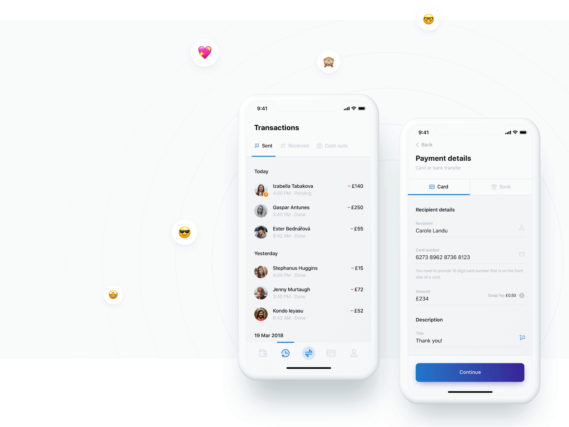 Swap is a P2P mobile payment app enabling users to send money to anyone from their contact list, including any bank account and debit card number.