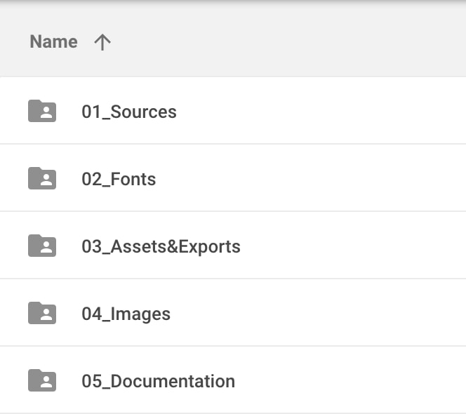Each folder (Visual and Wireframes) contains all source files (.psd, .fig, .sketch, etc.). It depends on the project, but if we have multiple file sources, we create subfolders for each .psd, .fig .sketch file, or any other extensions.