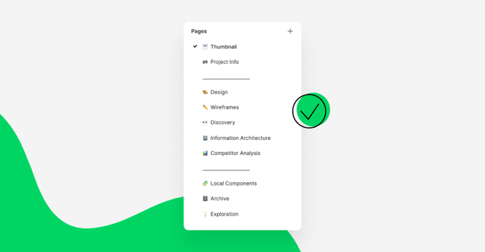 Depending on how big the project is and what the design process looks like, add additional dedicated pages – for example, prototypes with flow animations, information architecture, competitor analysis, etc. You can also use blank page dividers to keep them visually separated (see the example below).