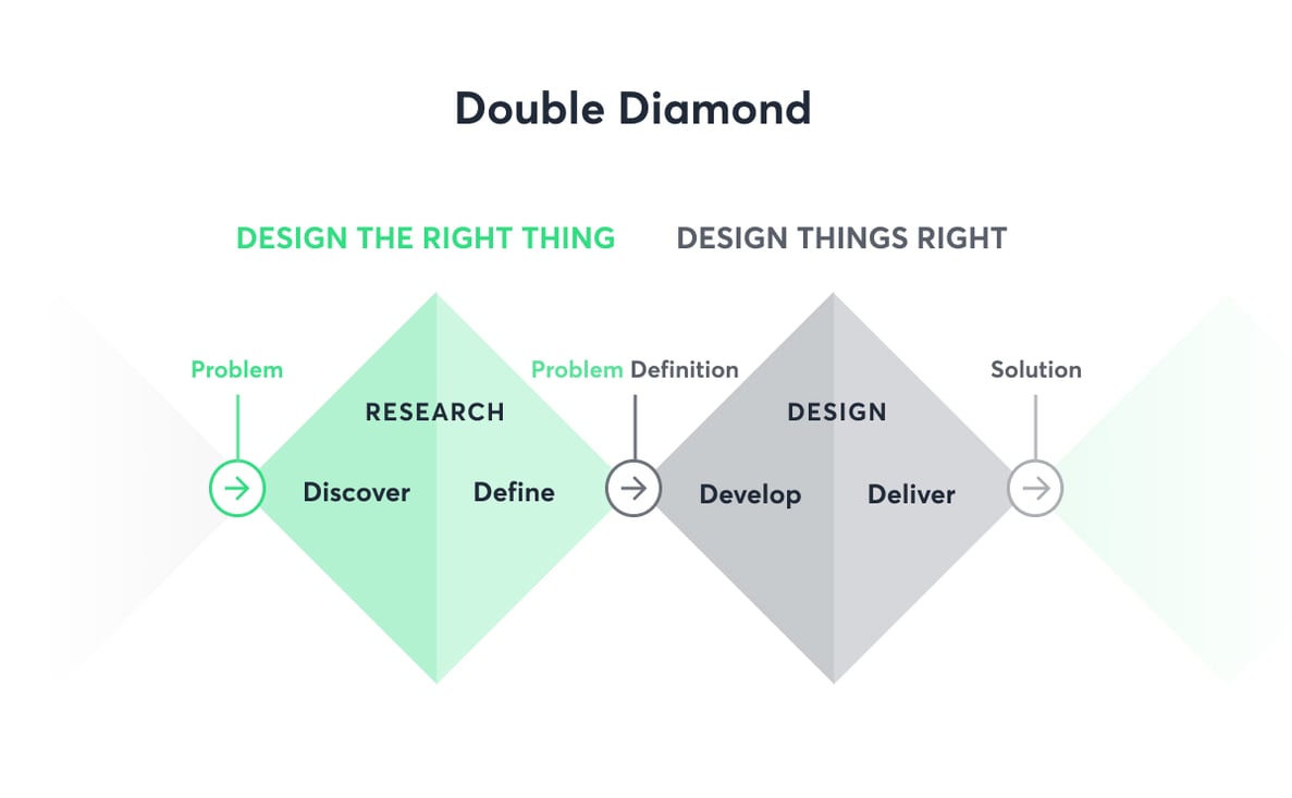 The Double Diamond design process is a framework that enables designers to create innovative solutions to solve complex problems. The Double Diamond design process is composed of four phases (Discover, Define, Develop, and Deliver) known for so-called divergent and convergent thinking approaches.